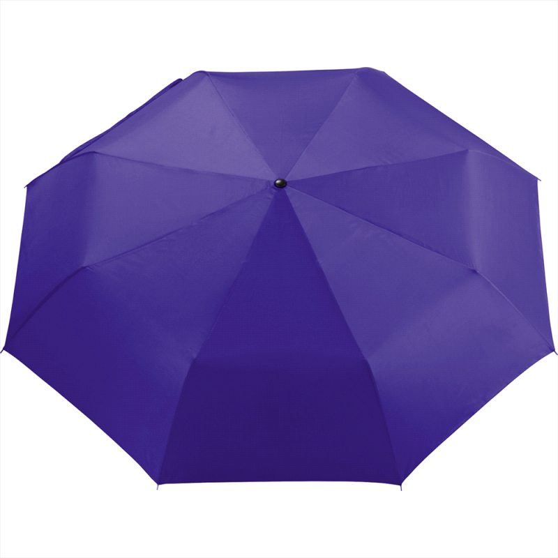 Manual opening. 41 inch arc. Polyester canopy. Three-section folding metal shaft. Ergonomic matte black plastic handle with wrist strap. Folds to only 9-1/2 inch long.