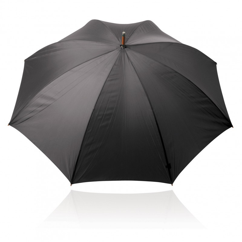 Whilst sheltering their partners from the elements, this 75cm umbrella will expose your clients promotional logo to a wide audience with style and practicality. Features: 75cm Executive Golf Umbrella*Manual open*Wood shaft & electroplated steel twin ribs*Windproof spring*Wooden hook handle*190T nylon canopy*Wooden ferrule*Plastic tips