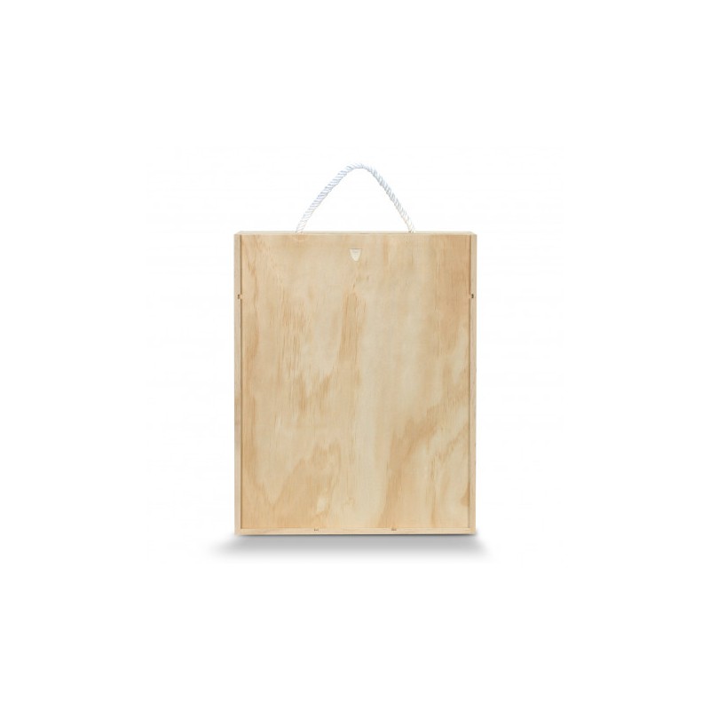 Elegant wine gift box made from natural pine wood with a sliding lid that offers a large branding area. The box is designed to hold three standard wine bottles and has built-in dividers with shredded paper filling. A woven rope handle makes it easy and comfortable to carry.