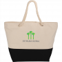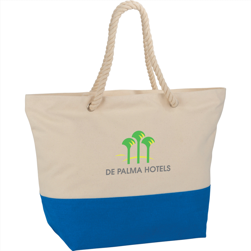 The Zippered Rope Handle 12oz Cotton Canvas Tote has a zippered main compartment with a color accent on the bottom band. The 22 inch soft rope handles also make it easy to carry.