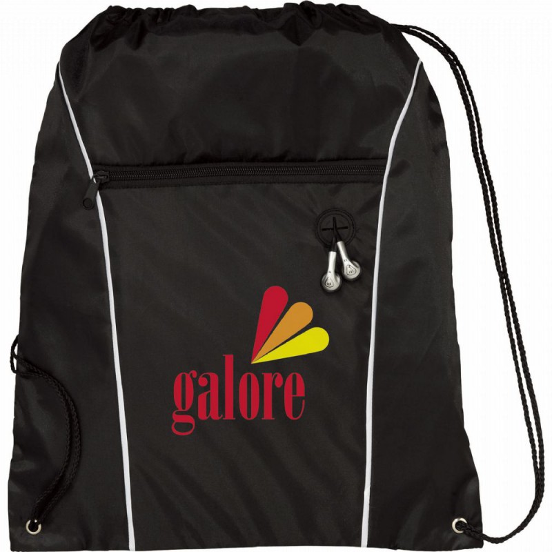 Open main compartment with drawstring rope closure. Zippered front pocket with earbud port. Earbuds not included.
