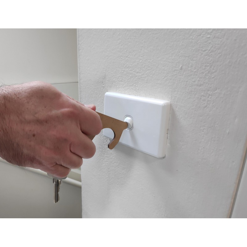 This innovative product is being manufactured in-house and is designed to HELP STOP THE SPREAD of COVID-19. It allows you to open and close doors as well as push buttons without physical touch. Touch Guard Keyring will form a physical barrier between your hand and the thousands of surfaces you touch every day. The hook section is specifically designed to be able to open a range of different sized door handles. It also opens filing cabinets, drawers and cupboards, if it has a handle…Touch Guard Keyring will open it! The button tip on the end of Touch Guard is designed for pushing Elevator Buttons, Light Switches, Pedestrian Crossing Buttons, Alarm Keypads and other pressure sensitive panels. Supplied with a stylish stainless steel keyring attachment as well as product use instructions. Made in Australia from Medium Density Fibreboard , better known as MDF, Touch Guard can be imprinted with your logo using a range of decorating techniques. The 1st option is Laser Engraving, where your logo is burnt into the timber creating a stylish yet subtle effect. The 2nd option is pad printing and the 3rd option is digitally printing your logo in multi or full colour, for maximum impact.