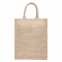 High quality stylish environmentally friendly large laminated jute shopping bag made of 2 natural colours with a large front pouch, laminated inside with padded cotton handles, a debossable leather patch stitched on front pouch, seamed edges. A great promotional bag.