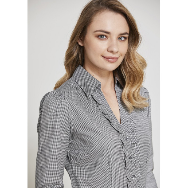 Y-line placket with unique fashion pleat detail,Waist and bust darts for elegant shape. Fabric: 55% Polyester, 45% Cotton,Yarn dyed check with mechanical stretch.