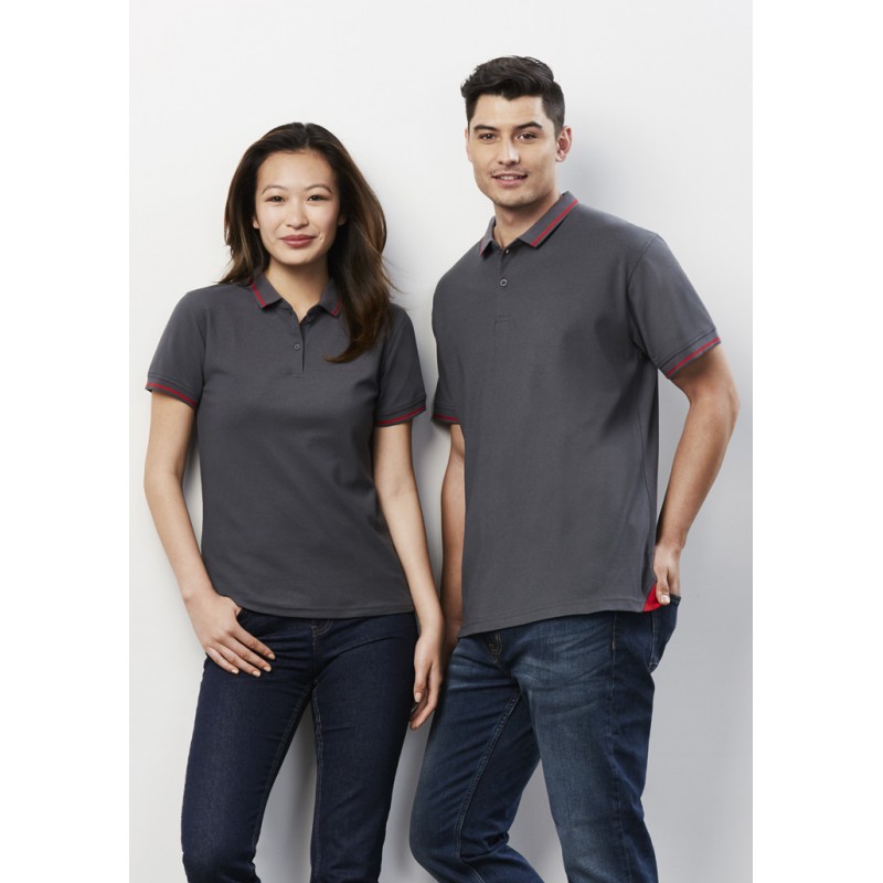 Contrast hem panel detail,New slim knitted stripe collar and cuff. Fabric: 50% Cotton inner, 50% BIZ COOL Polyester Pique Outer,170 GSM,UPF rating - Good.