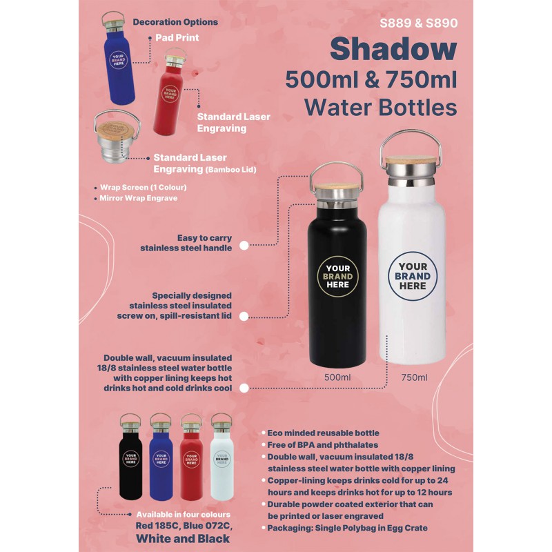 750ml capacity bottles, are made of double-walled stainless steel and are vacuum insulated for maximum temperature control. With a convenient twist off cap and carrying handled and are able to hold ice for up to 24 hours, or keep hot drinks HOT. All bottles are crafted from food grade stainless steel and are BPA Free. These are packed in a single polybag with egg crate package. Hand wash only. Do not freeze or microwave. Product Specifications: • Double wall, vacuum insulated 18/8 stainless steel water bottle with copper lining • Copper-lining keeps drink s cold for up to 24 hours and keeps drinks hot for up to 12 hours • Durable powder coated exterior that can be printed or laser engraved • Eco minded bottle and reusable • Free of BPA and phthalates Packaging: Single polybagged in Egg Crate