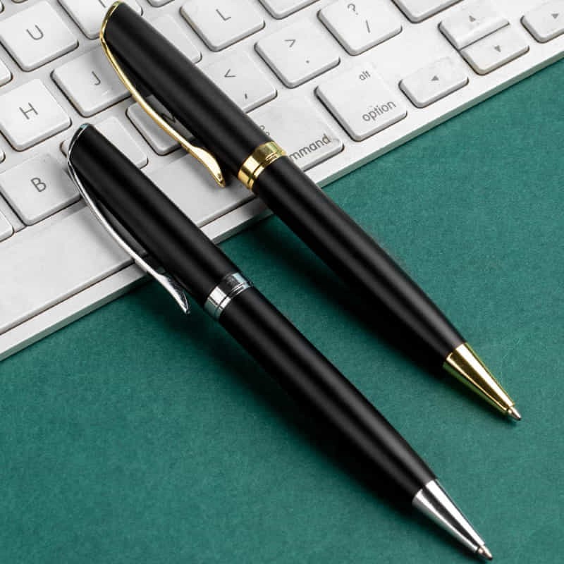 Classic design of heavy brass made metal pen, matt black barrel with silver chrome coated, engraves to a shiny mirror finishing, gold and silver trim. Twist action with Parker-Type German manufactured black ink refill, 1800 meters writing distance, tungsten carbide ball provides you with quality writing.