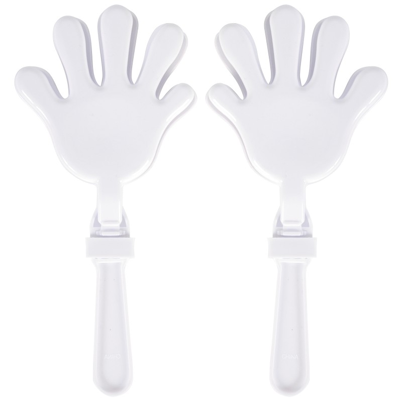 Hand shaped klapper. Inner hand and handle one colour with contrasting colour outer hands.