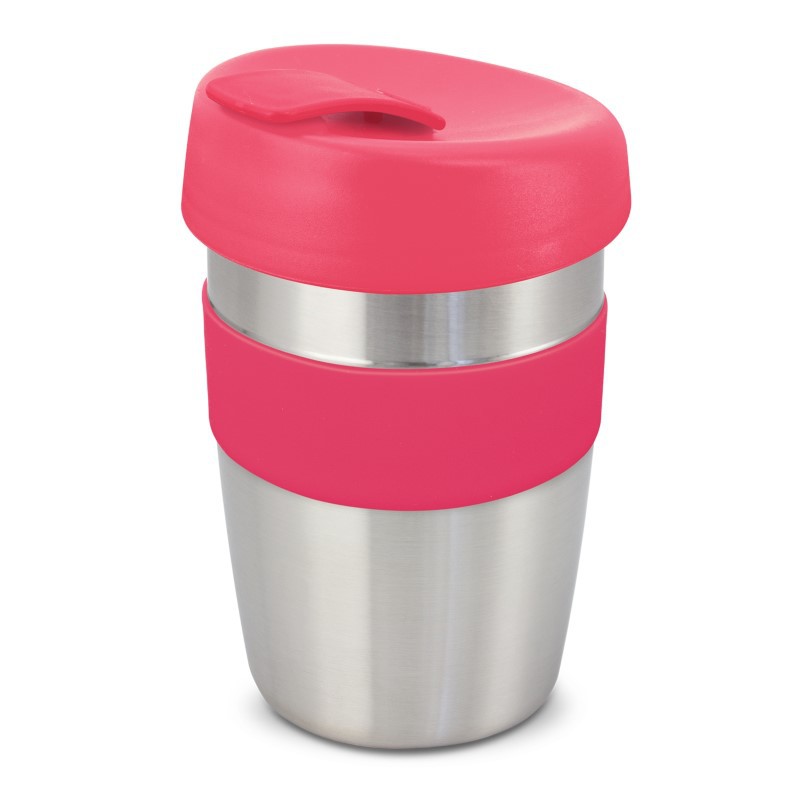 Design inspired 350ml double wall reusable coffee cup which will keep drinks hot for longer and remain cool to hold. It has a heat-resistant silicone band and a secure screw on lid with a splashproof flip closure. The cup has a stainless steel outer wall and the inner wall, lid and flip closure are manufactured from polypropylene. All the materials used are BPA-free. The cup, lid, flip closure and band can be mixed and matched in any colour combination from the standard colours. Up to five different colour combinations are included in the price and more are available for an additional charge. It is presented in a black gift box. This product is not dishwasher safe and handwashing is recommended. Express Cup Elite is protected under New Zealand Design Registration No. 419451 and Australian Design Registration No. 361937.