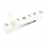 Pill storage box features seven compartments.  Each day of the week is conveniently labeled on the hinged, snap-up lid.--Undecorated Stock Available in 5 Working Days--