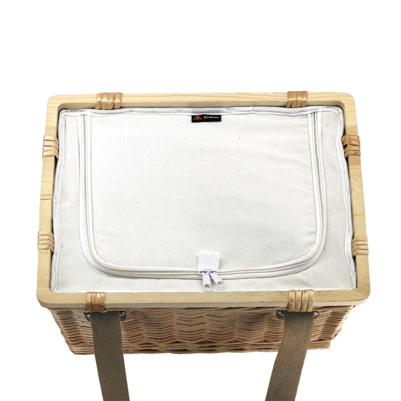 This exquisite cooler basket has internal insulated lining with a zippered cover. The timber board is made from lacquered pine wood and the basket features two thick cotton carry straps. Perfect for all outdoor activities! Not recommended as a cheese board.