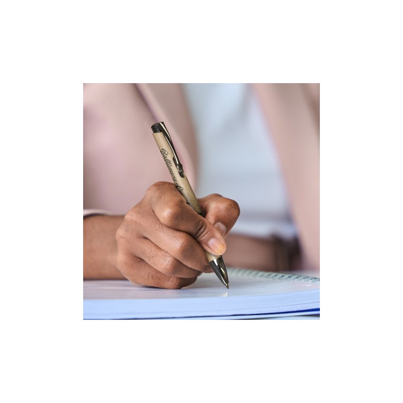 Retractable ballpoint made from a 50/50 blend of wheat straw fibre and ABS plastic with a matte finish and shiny chrome accents. It has a black large volume refill with 1200 metres of German manufactured Dokumental ink. Panama can be presented in an optional pen sleeve or a gift box.