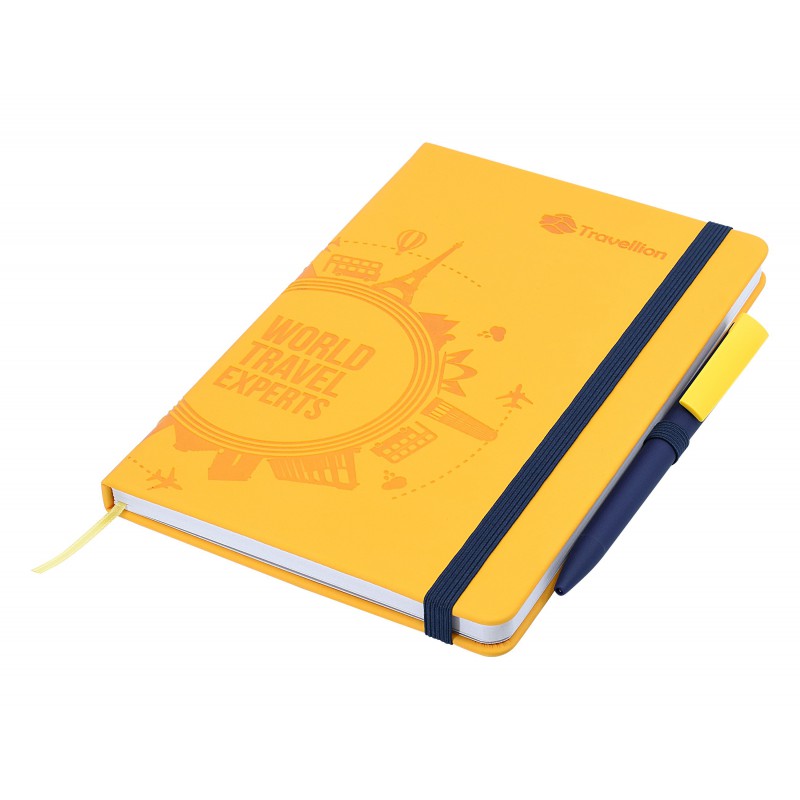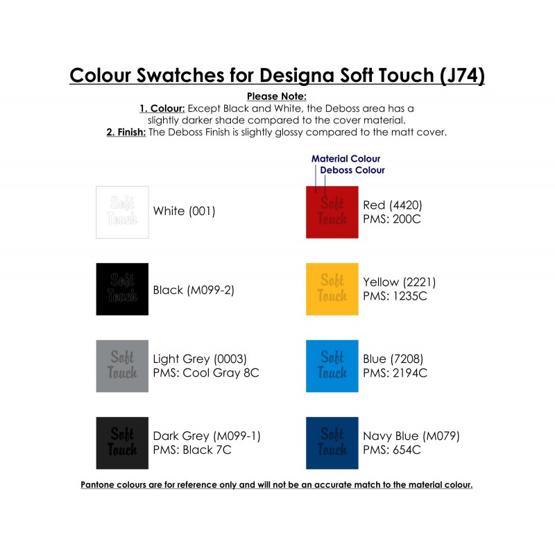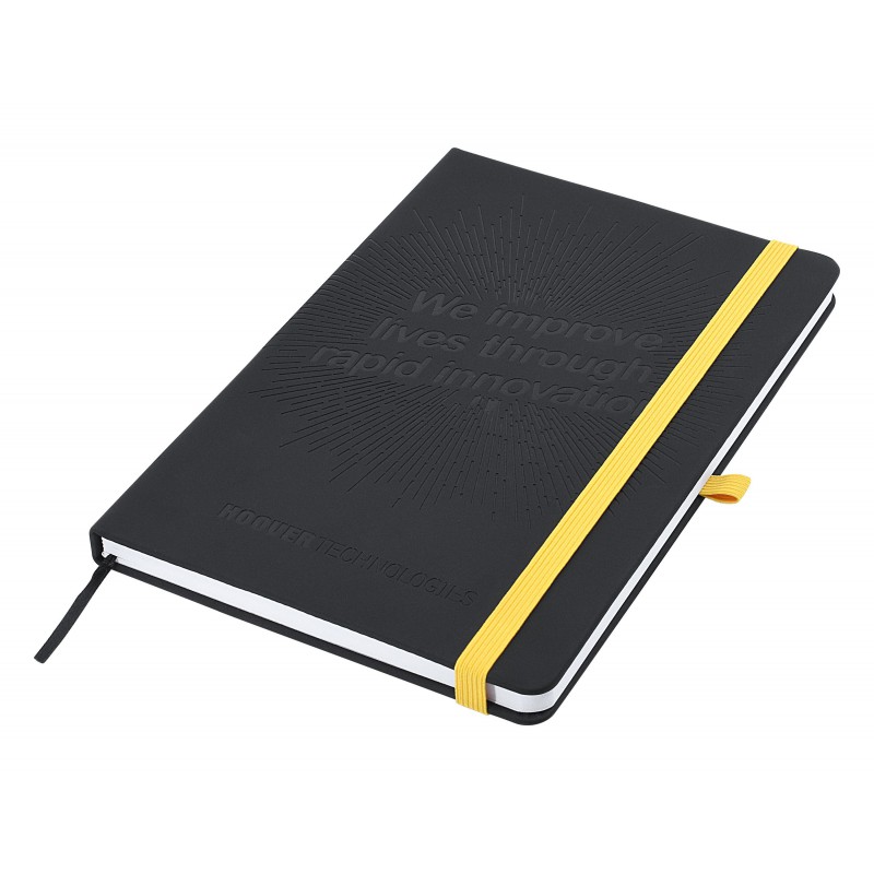 Have you ever wanted to design your own Debossed notebook? Well now you can with ‘Designa Deboss Soft-Touch’. We make it easy - you simply select from our list of options and we make it happen. Cover: Matt Soft-Touch PU Hard Cover, Debossed on front cover (full A5 area available for debossing). This Thermo-sensitive Soft-Touch cover will deboss in a darker shade than the background for a result that will truly impress. Covers are available in a large range of colours. Size (when closed): A5 size (146mm wide x 213 high x 14mm thick). Paper: 160 pages, 70 gsm paper. Options: Paper: Select: 160 pages Ruled, 160 pages Blank, Combination 96 pages Rules + 64 pages Blank. Elastic closure width: Select: 6mm, 9mm or 15mm. Elastic pen loop width: Select: 6mm, 9mm or 15mm (elastic closure and pen loop must be same width). Elastic colours: Select: white, black, yellow, green, red, orange, pink, purple, light blue, royal blue, navy (elastic closure and pen loop must be same colour). Ribbon marker: Select 1 or 2 ribbon markers from the following colours: white, black, yellow, green, red, orange, pink, purple, light blue, royal blue, navy. Fly sheet: Front fly sheet (inside front cover and adjoining page) can be printed in full colour. Back flysheet (inside back cover and adjoining page) can be printed in full colour. If this option is selected then expandable inner pocket cannot be selected. Expandable inner pocket: Attached on inner back cover (if this option is selected then back fly sheet cannot be selected).Pens not included.