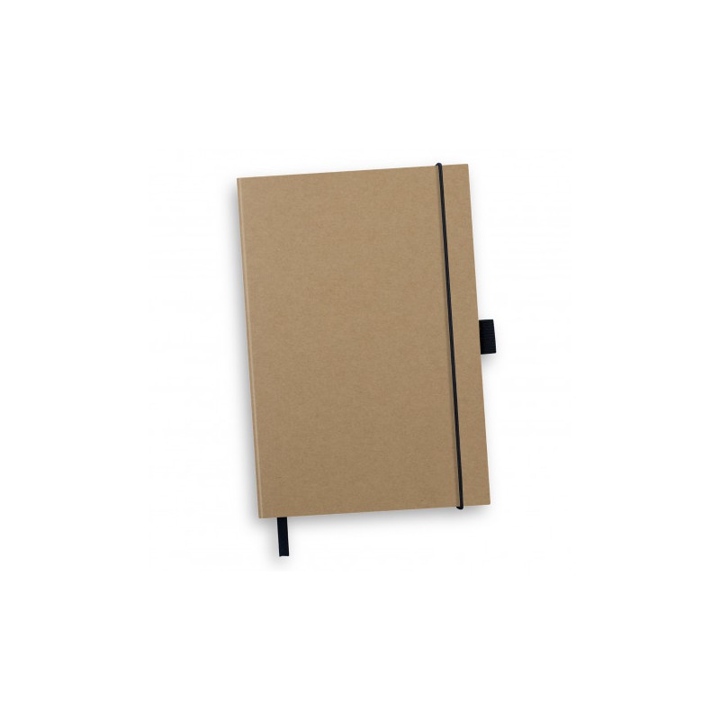 Stylish and functional medium-sized notebook with a hard kraft cover. The notebook features 80 leaves (160 pages) of 70gsm lined cream paper made using sugarcane waste, with a sugarcane logo printed on the flyleaf. The notebook also features an elastic closure, a pen loop and a bookmark ribbon.