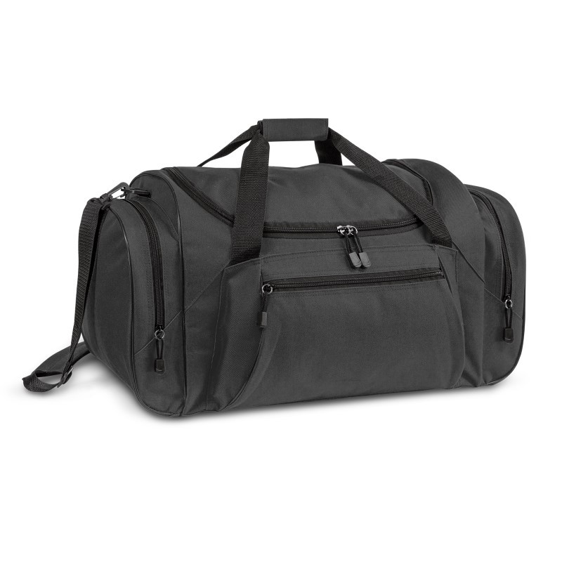 Large duffle bag which is manufactured from 600D polyester. It has an adjustable woven shoulder strap with a curved shoulder pad for maximum comfort. The shoulder strap is removable and the bag also has woven carry handles with a Velcro cuff. Other features include a sturdy reinforced base with plastic feet, three zippered external pockets and two external pockets.