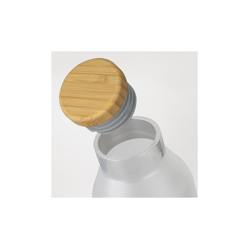 Elegant 600ml borosilicate glass drink bottle with a frosted finish and a natural bamboo lid. Borosilicate is lightweight, exceptionally strong and shatter-resistant. The bottle features a secure push on lid with a silicone seal and is presented in natural packaging with NATURA branding.