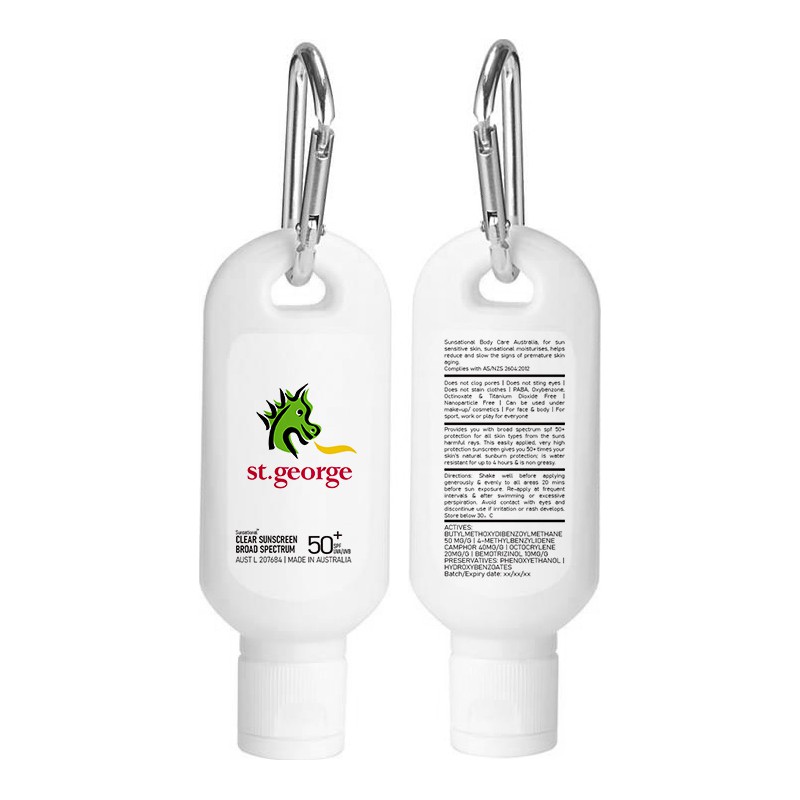 Promotional Sunscreen & Lip Balm,get branded logos on the 60ml Australian Made Spf50 Sunscreen Lotion With Carabiner